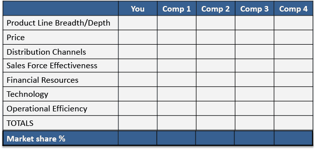 - When filling in the columns, you can use a number ranking, a red-yellow-green ranking, or, my personal favorite, a Harvey-ball system as shown below. Using a system like this will allow you, in a glance, to look for areas of weakness in your competitors, which will also represent unmet customer needs that are ripe to become filled by one of your strategic initiatives.